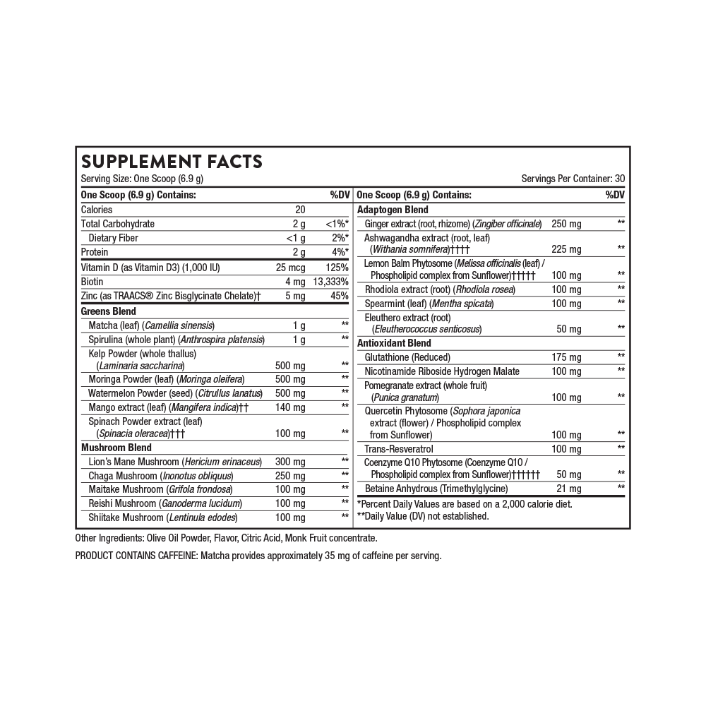 Thorne’s Daily Greens Plus provides a blend of great-tasting, clinically studied ingredients that support a healthy mind and body.* Daily Greens Plus provides a comprehensive approach to foundational nutrition, with the added focus of supporting healthy aging.* This unique greens powder formula combines the highest-quality sources of green nutrition with adaptogens that support a healthy stress response and adrenal function, as well as antioxidant blend that boosts the body’s defenses against oxidative damage and a mushroom blend that promotes optimal immune function.*