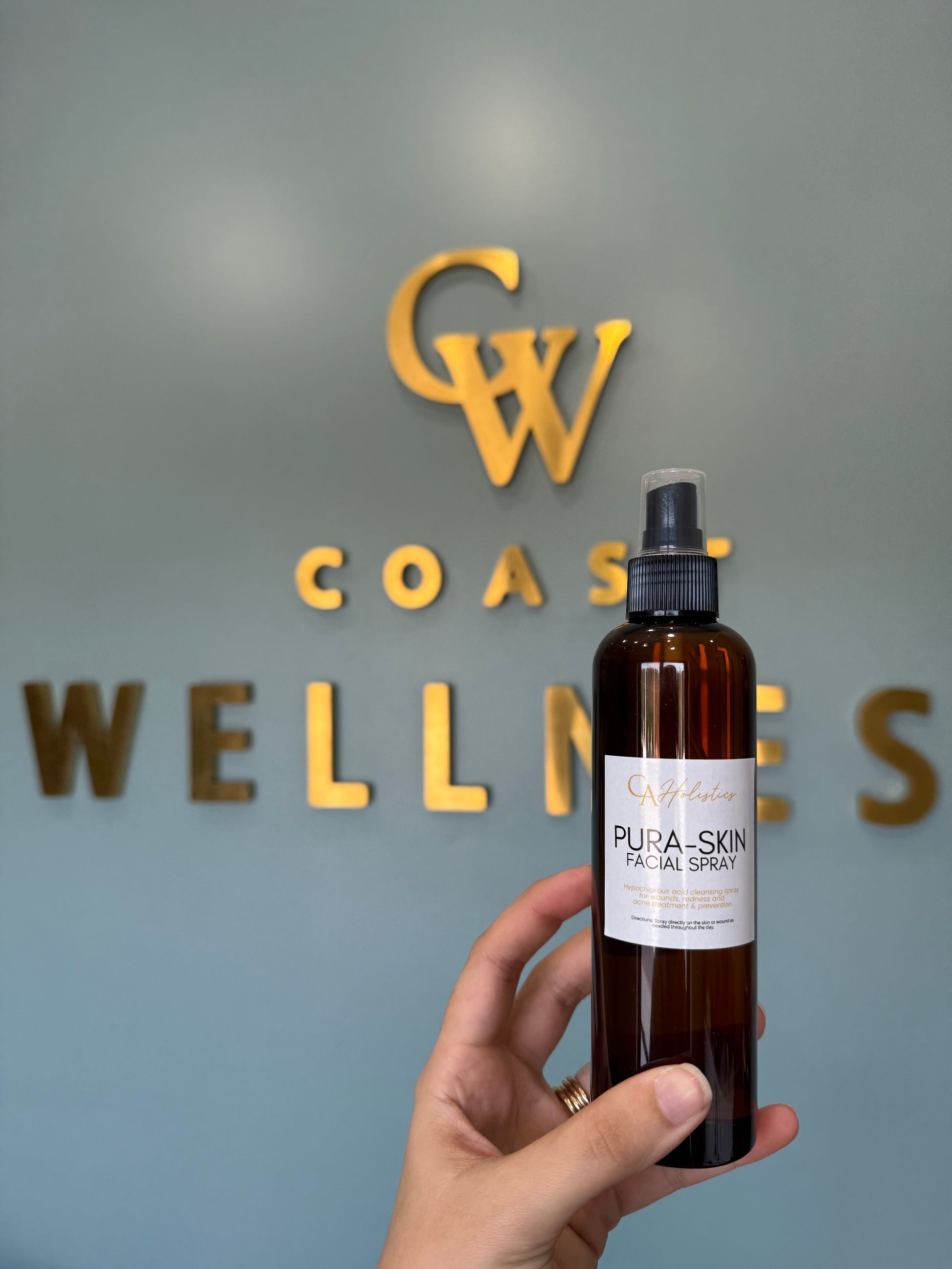 Hypochlorus acid spray for wounds and acne. Made in house by CA Holistics. Good for spraying your face after a workout or a day at the beach. Safe for children.